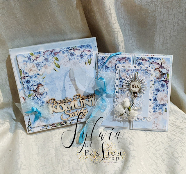 Jedno jest pewne, zawsze wyjątkowe pamiątki powstają z papierów PassionScrap, tym razem coś dla chłopca. Bardzo podobne kartki, choć z innych kolekcji, jedna to Musical Spring, druga Lovely Day, ciut inaczej ozdobione pudełka, wszystko w błękitach z delikatnym komunijnym akcentem.